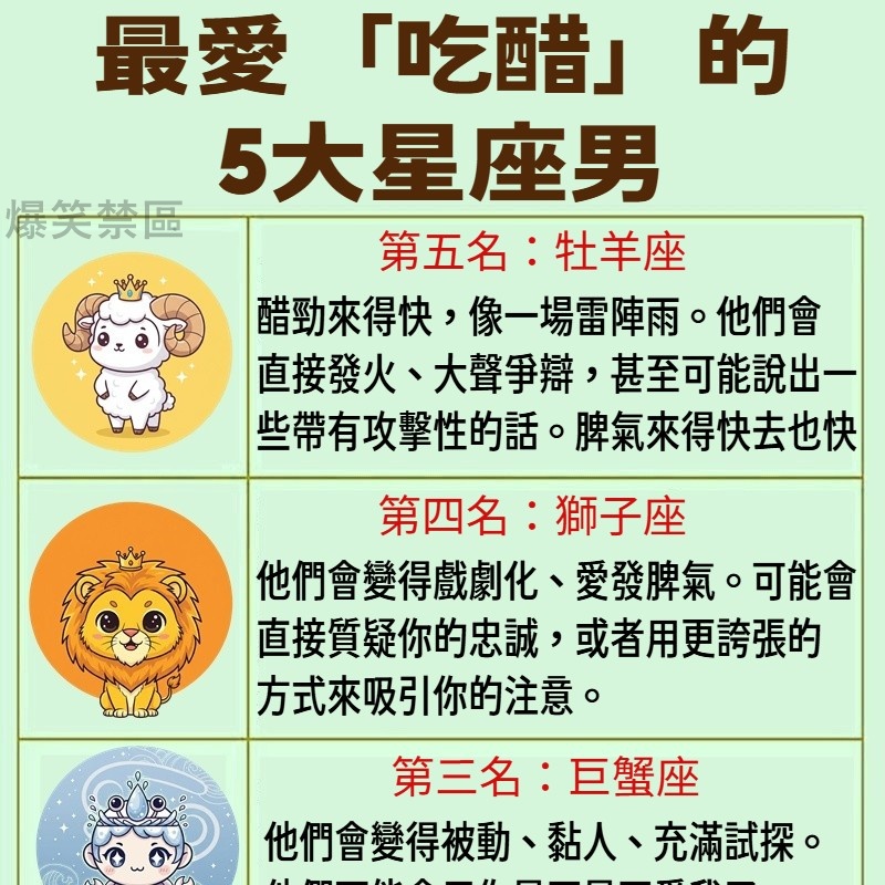 吃醋表現: 他們會變得悶悶不樂、脾氣暴躁,並可能通過「懲罰性」地減少對你的關心或不再提供物質享受來表達不滿。他們的醋勁來得慢,但一旦發作,需要很長時間才能平復。