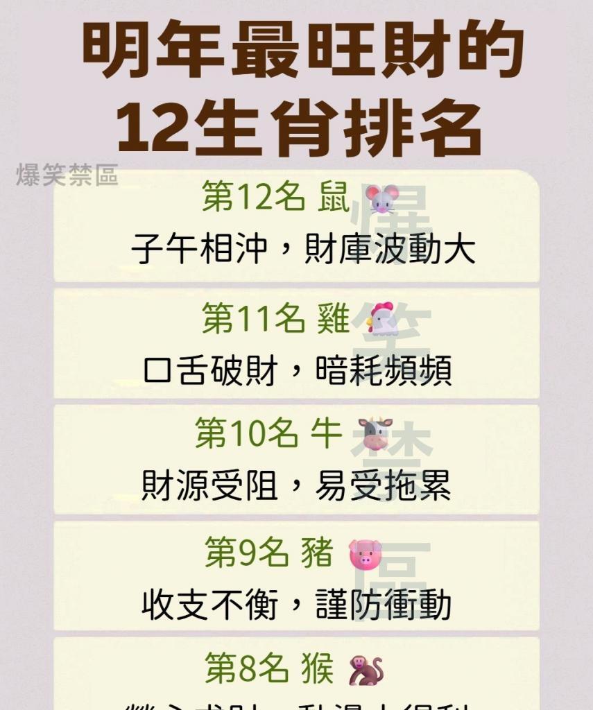 第12名 鼠 🐭 子午相沖,財庫波動大。 屬鼠人明年犯太歲「相沖」,財運極不穩定,容易有意外的開支或大筆金錢耗損。切記不宜進行高風險投資,保守儲蓄為上。
