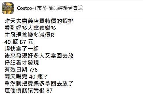 不過這份「撿到寶」的喜悅沒維持多久,大家的笑容很快僵住。原來這位網友仔細一看,發現這批養樂多的**有效期限只剩兩天!**也就是說,要在48小時內喝完40瓶。想到這裡他苦笑說:「這個價錢讓我真的很『87』啊!」隨手就把商品放回去了。