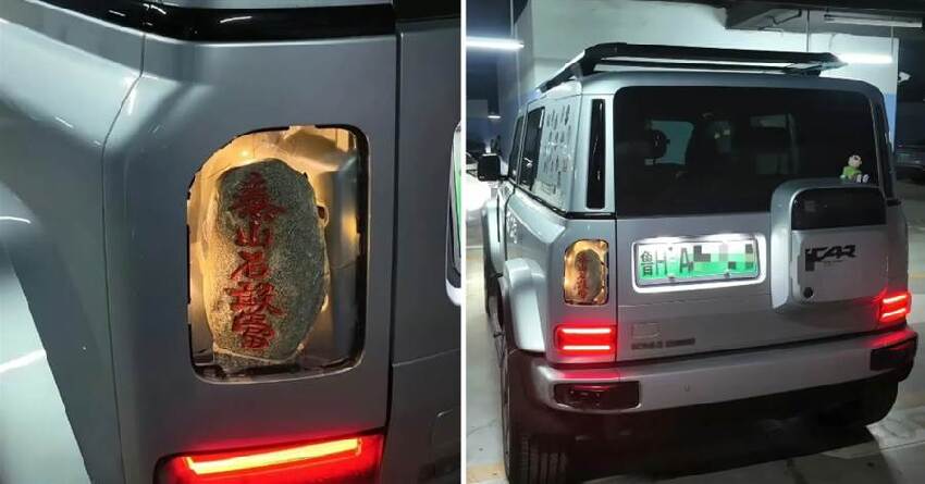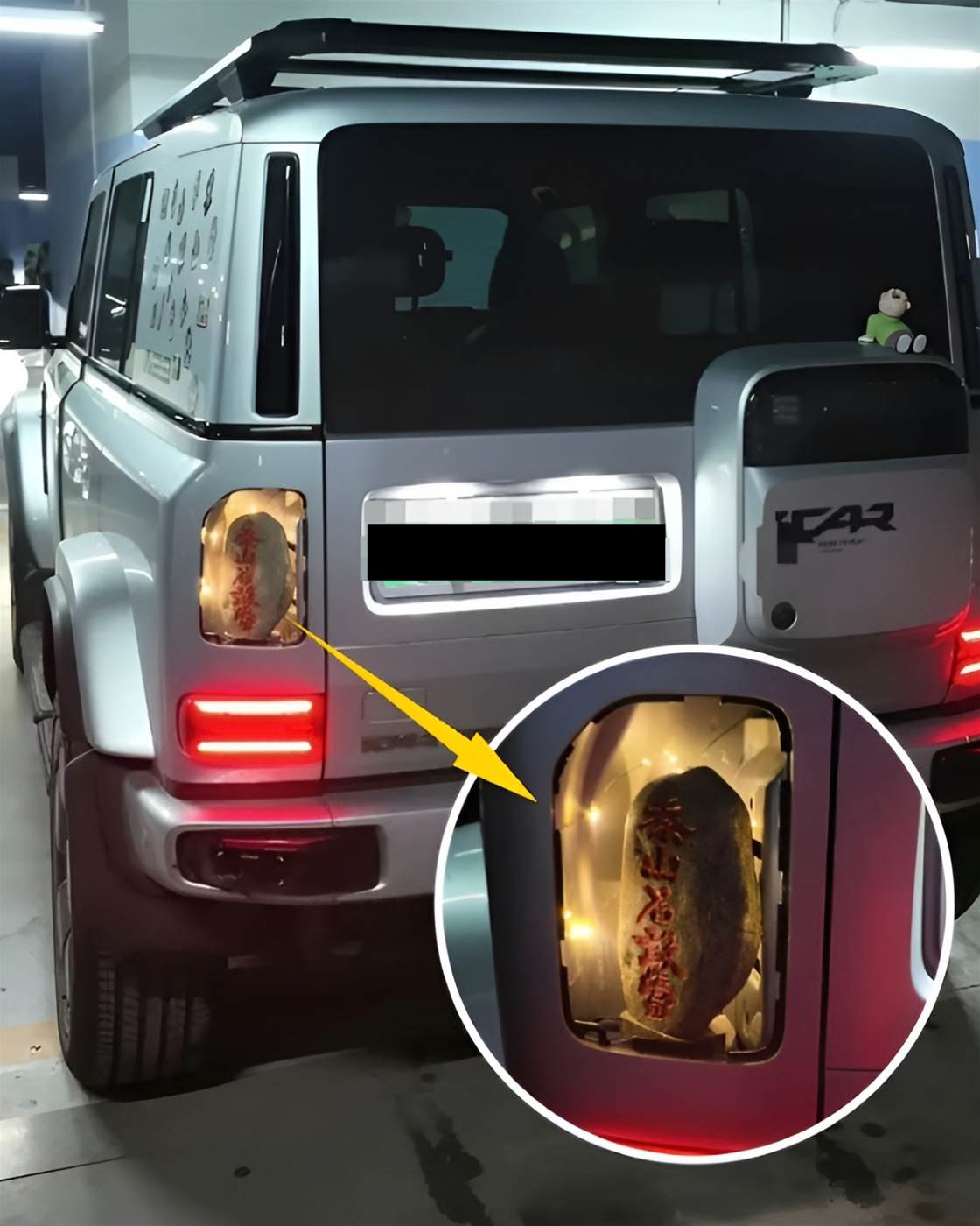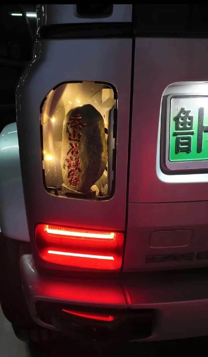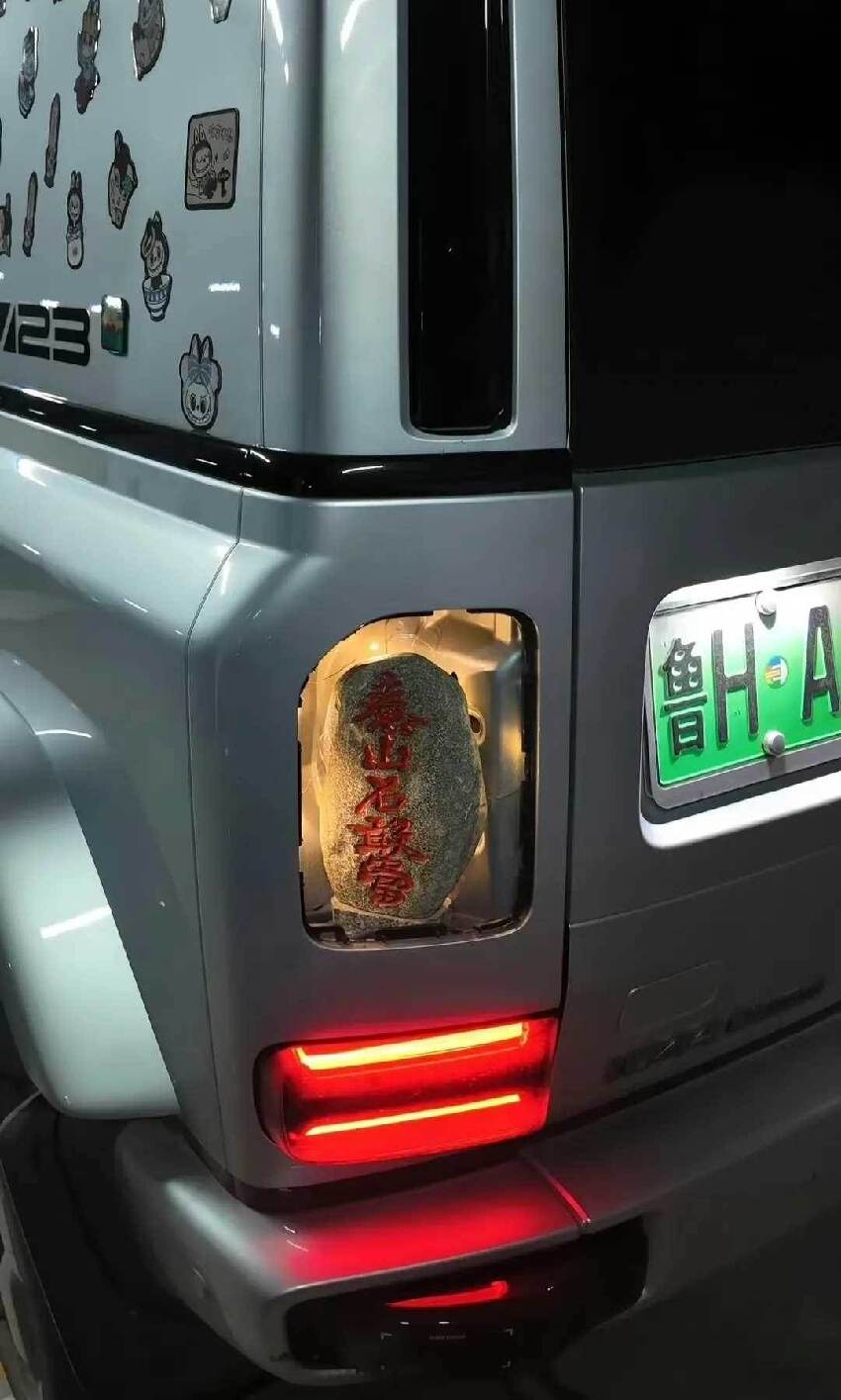 這塊石頭被巧妙地安置在車輛的尾燈之間,上面刻著一些字跡,雖然在行駛中可能難以辨認,但這種裝飾無疑為車輛增添了一份獨特的個性。
