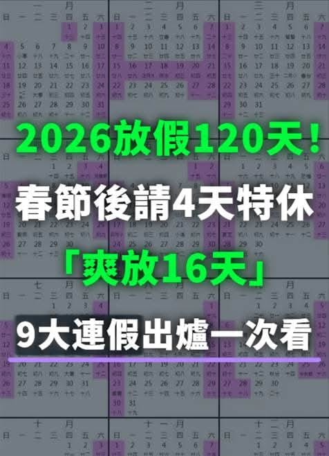 政府公告指出:2026年將有 九個主要連假時段,加上例行國定假日與補假機制,預估全年放假總天數可達約 120 天,涵蓋週末與連假。