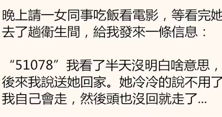 在這個科技發達的年代,也因為我們想知道什麼都能夠上網搜索,漸漸地我們也變得越來越不純潔。而今天我們要來看看一些在 內涵社區上頗有深度的梗文,那大家如果能夠秒看懂的話就代表著你已經不純潔了,是時候要去面壁思過了 wwwww#1昨天晚上我請女同事吃飯、看電影,等看完,她去了趟洗手間,給我發來一條信息,「51078」,我看了半天,沒明白啥意思。