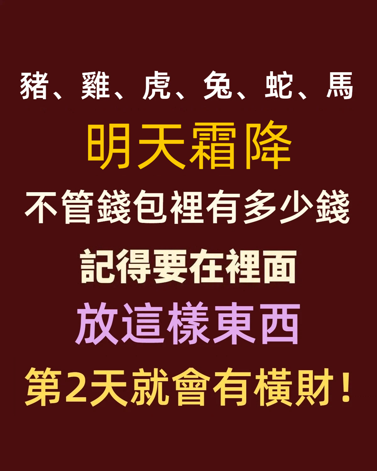 今年霜降特別適合 招橫財、補財庫、轉旺運,尤其是這六個生肖:「🐷豬、🐔雞、🐯虎、🐰兔、🐍蛇、🐎馬」,千萬別錯過!