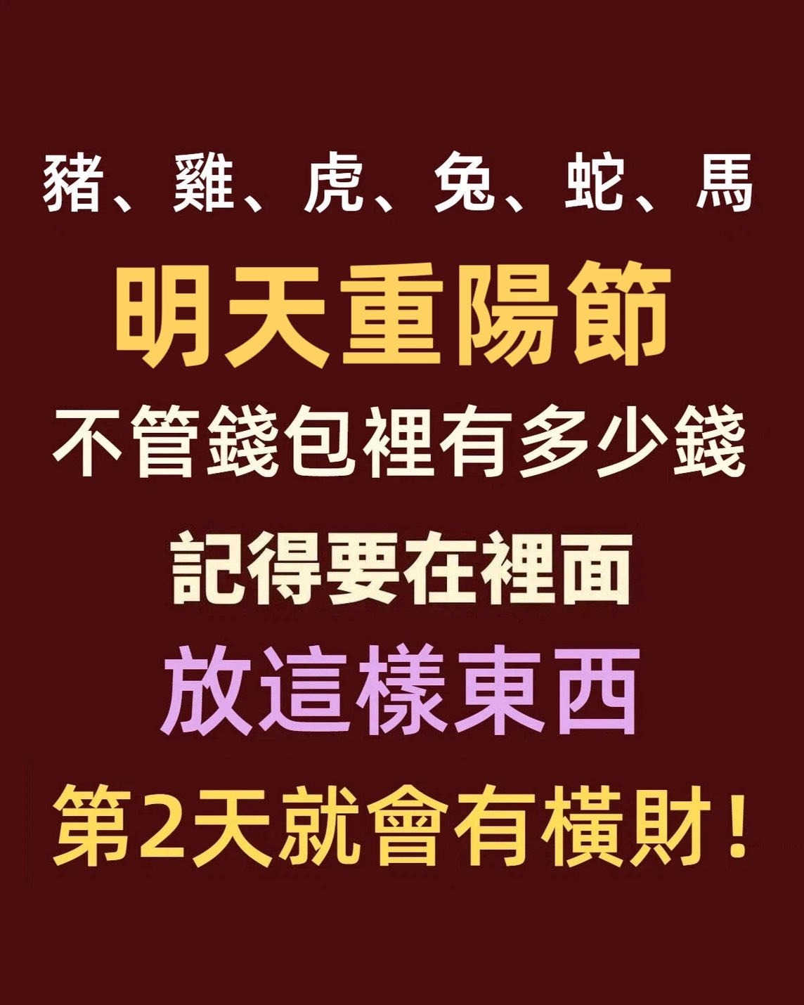 重陽節除了登高、賞菊,其實還是個「轉運補財」的大日子!今年的重陽節(農曆九月初九),對屬豬、屬雞、屬虎、屬兔、屬蛇、屬馬的朋友來說,是特別容易「財氣爆棚」的一天,只要照著以下做法,隔天就可能有意外之財上門💰!