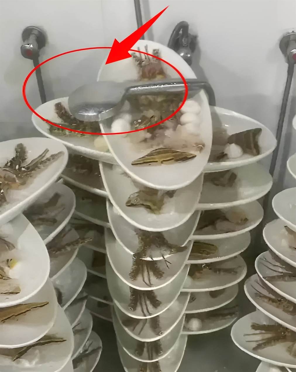 最近有網友分享一段餐廳後台的實拍照,瞬間在網路上掀起巨大討論。照片中一疊又一疊的餐盤直立堆高,看似準備端上桌的海鮮料理,卻讓人一秒倒胃口——因為其中一個餐盤竟然直接被一支湯匙卡住壓著,餐盤裡的食材還是生的海鮮與龍蝦料,看起來只會越壓越不衛生。