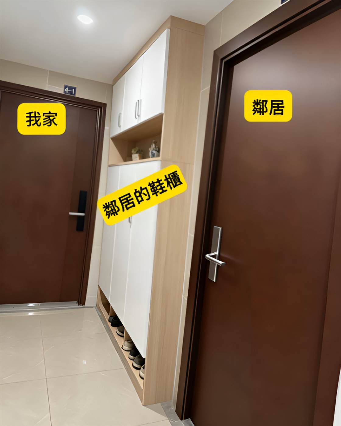我家門口和鄰居家門口之間,本來就只剩下一條不算寬的走道。結果某天回家一看,鄰居突然多了一個大型鞋櫃,直接貼牆放在公共走道上,幾乎卡在我家門前。