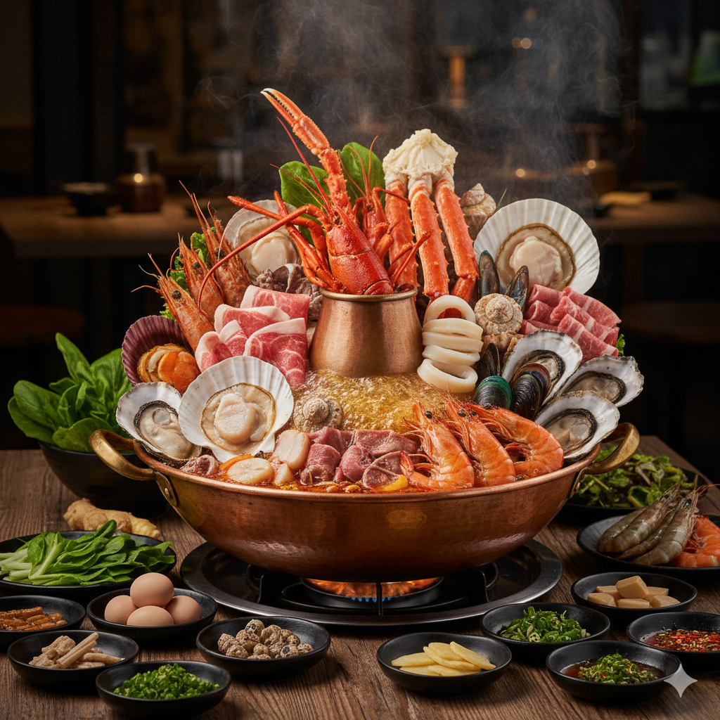 A. 熱氣騰騰的【海鮮痛風火鍋】: 滿滿的蝦子、螃蟹與鮮甜湯底。