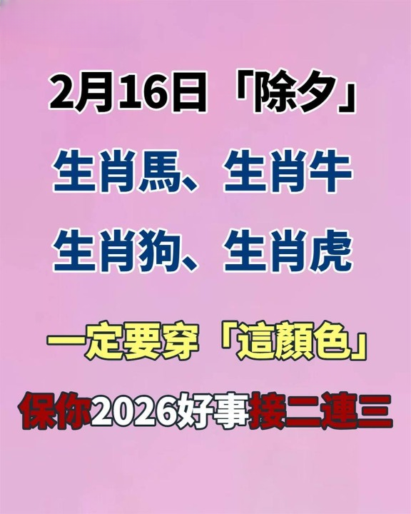 2月16日「除夕」生肖馬、生肖牛、生肖狗、生肖虎,一定要穿「這顏色」保你2026好事接二連三