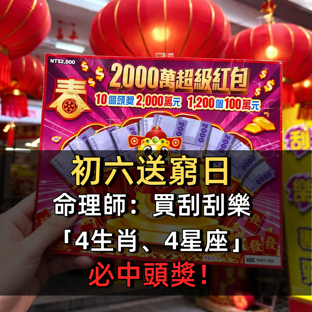 有命理師指出,今年初六財星入庫、偏財位大開,特別點名「4生肖、4星座」財氣爆棚,刮刮樂中獎機率大增,想試手氣的人千萬別錯過!