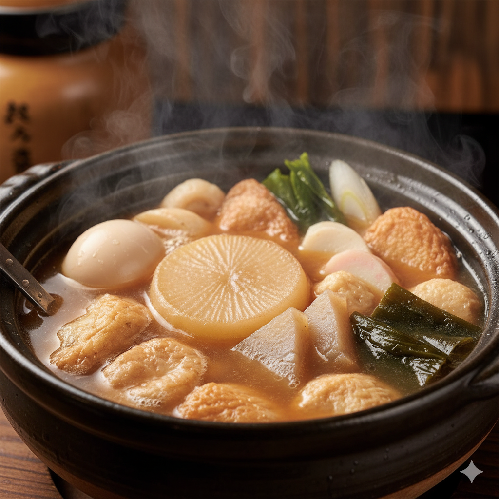 B. 🍲 熱騰騰的日式關東煮:所有食材在大鍋中相互融合,湯頭是精華。