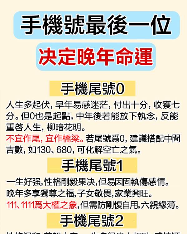 在數字命理中,「手機號最後一位」象徵人生的收尾能量,也就是晚年運勢的關鍵指標。