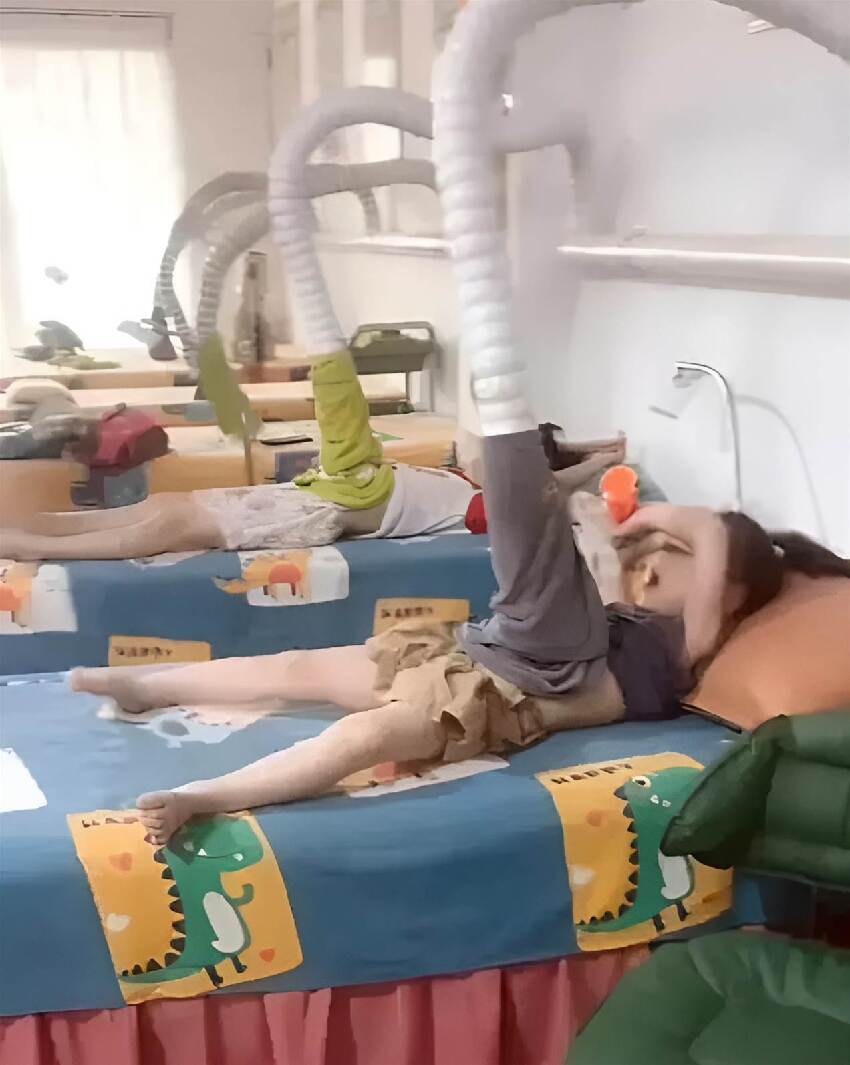 孩子們圍坐在一張張小床邊,這些小床上鋪著印有可愛恐龍圖案的床單,顯得格外溫馨。