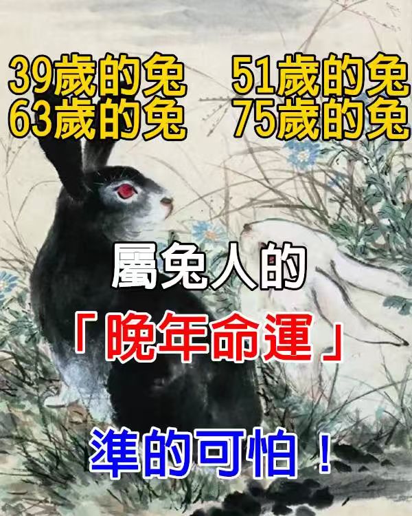 今天就來看看,39歲、51歲、63歲、75歲的屬兔人,這幾個年紀各自代表什麼樣的晚年命運。
