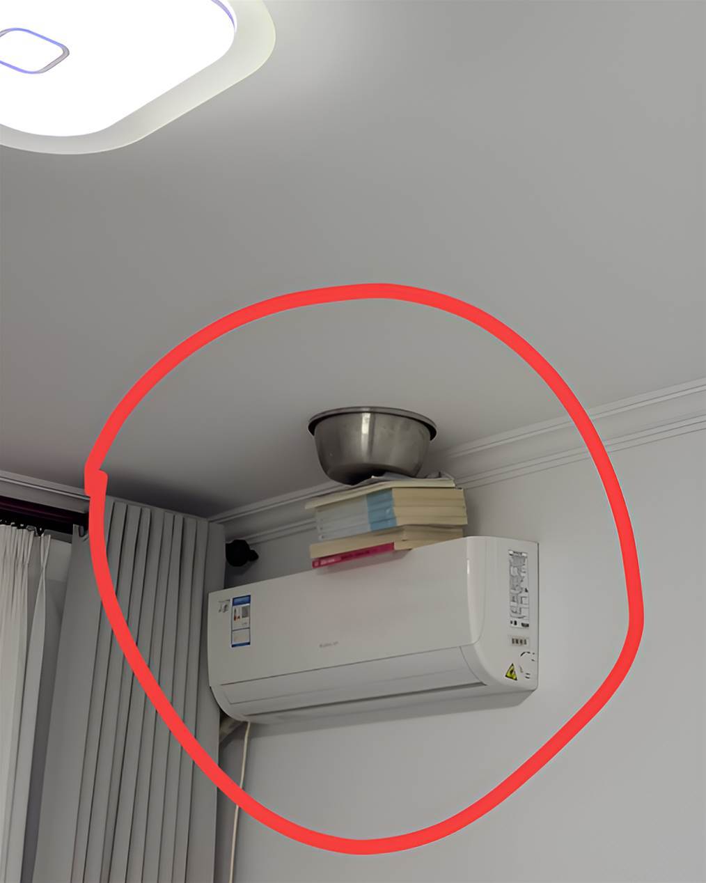 看似平凡的組合:老公在冷氣室內機上方墊了幾本厚書,並在書本最頂端放置了一個**「不鏽鋼鐵盆」**。