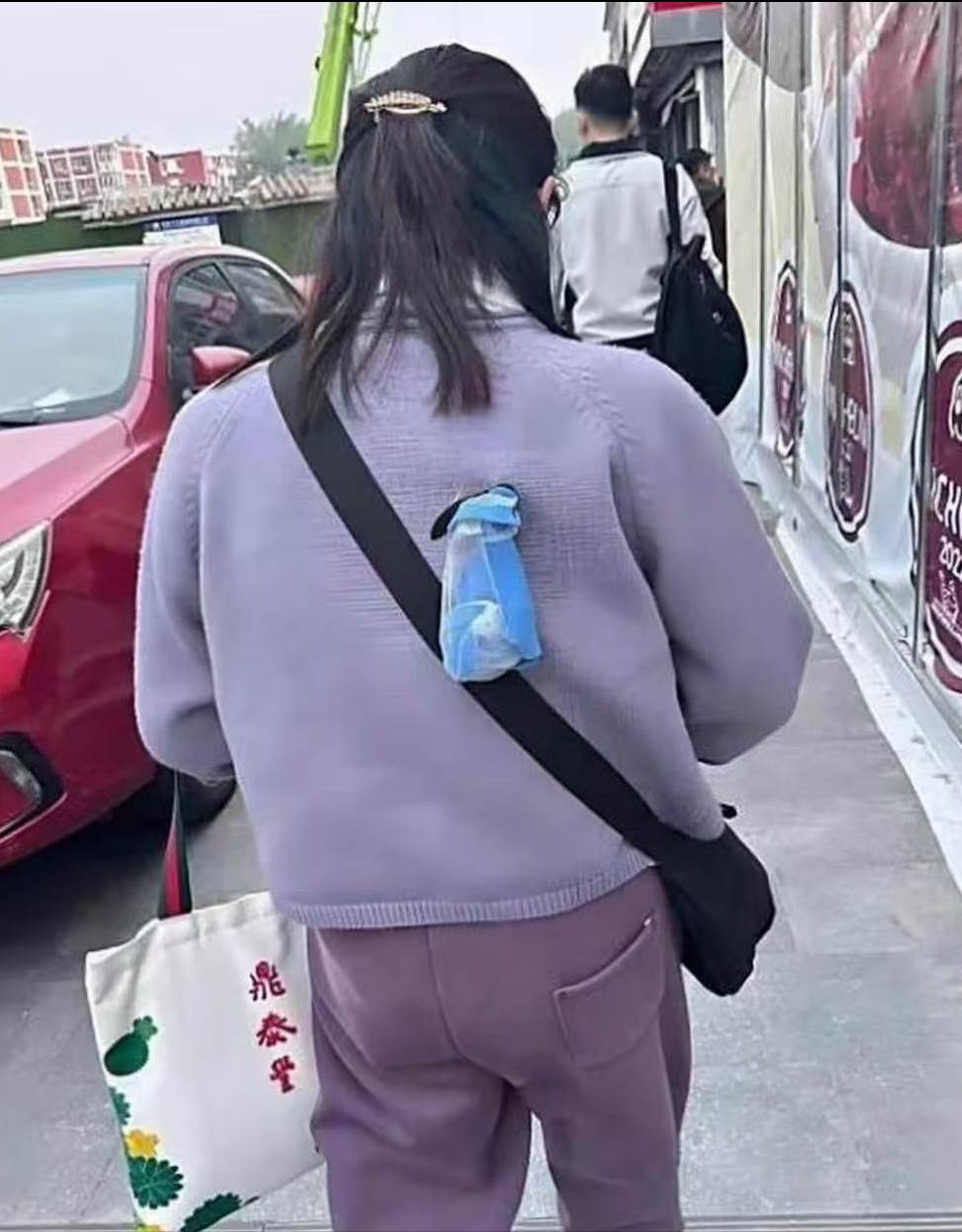 「跟了她一路了,要不要提醒她?」目擊這一幕的網友內心掙扎。女子背上的藍色網兜隨著步伐晃動,在淡紫色衣服上格外顯眼。路邊的紅色轎車旁,幾個行人投來好奇的目光,卻無人上前。