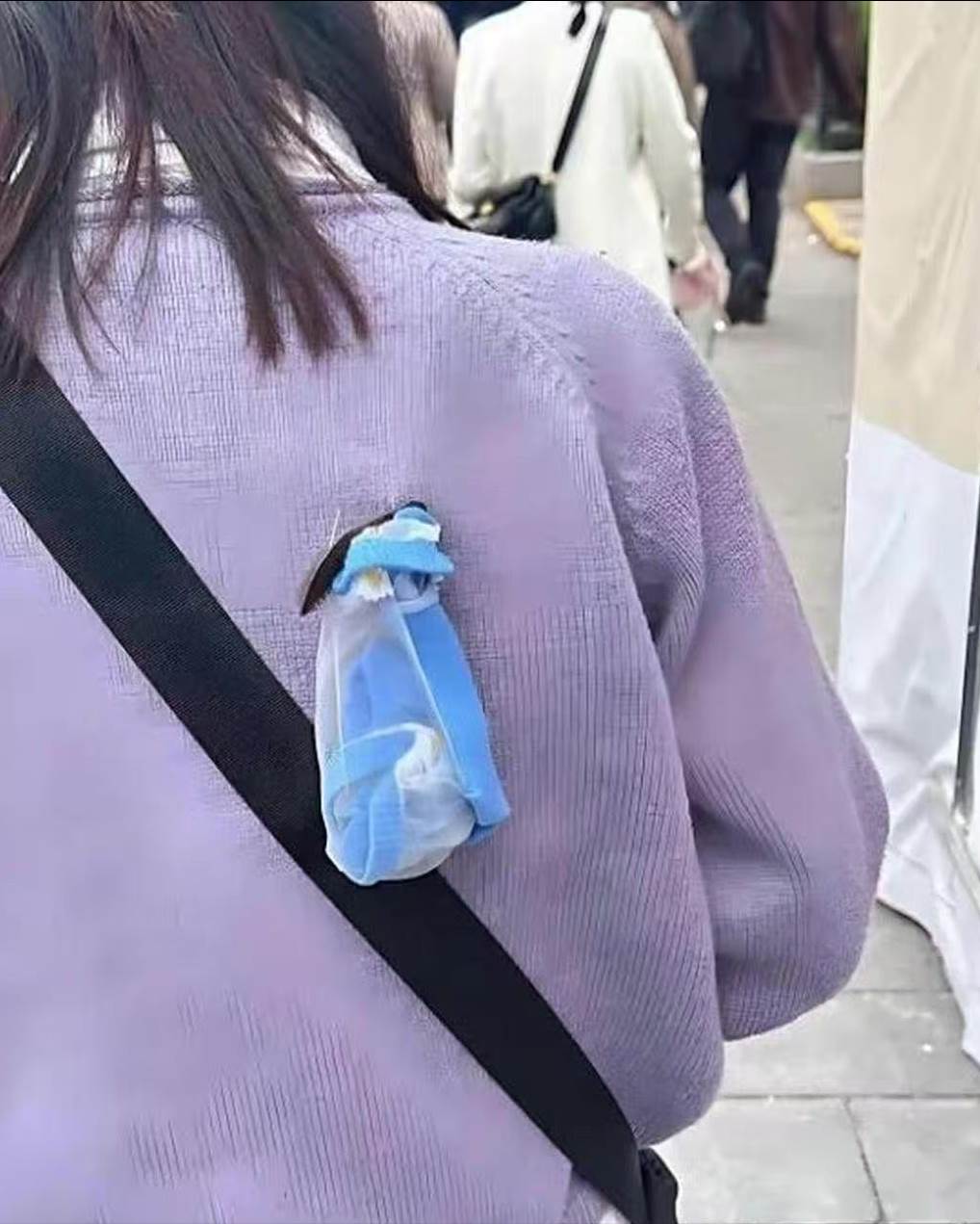 街頭,一名穿著淡紫色套裝的長髮女子匆匆走過。她背著黑色斜挎包,手提印有紅字的白色購物袋,渾然不知自己背後正上演著一場「時尚事故」——一個藍色東西,正牢牢黏在她背部,隨著她的步伐晃動。