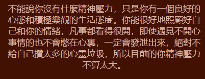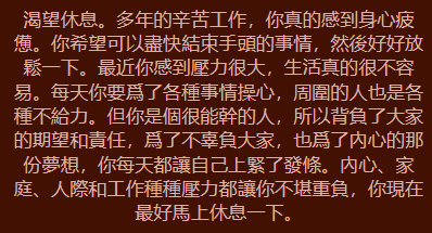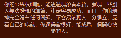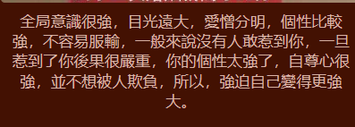 性格: 妳性格直爽,敢愛敢恨,不喜歡拖泥帶水。雖然有時會遇到挫折,但妳韌性極強。