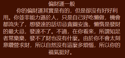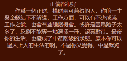 性格: 妳是一個愛家、追求穩定的人,最大的心願就是全家人平安順遂。
