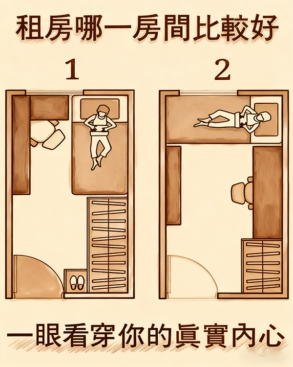 房間 1 的設計比較「方正緊湊」,床緊靠牆邊,書桌在床尾,空間利用明確。這類房間給人一種安全、秩序與掌控感。