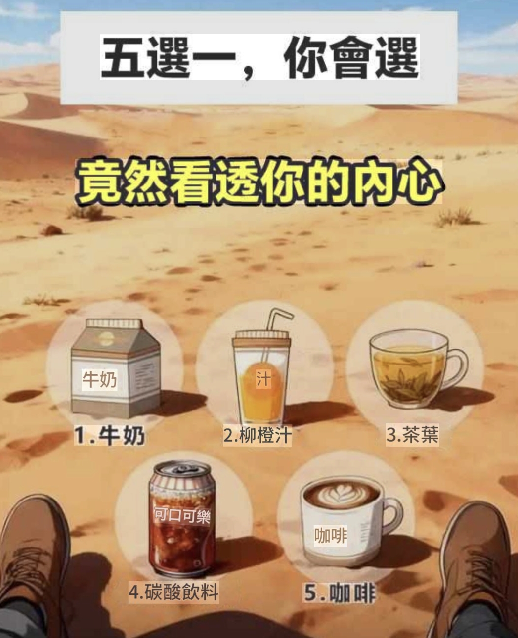 在沙漠中沒有帶水,五選一只能選擇一杯喝!