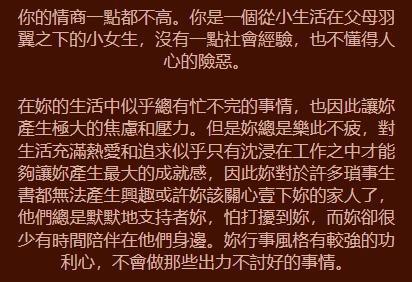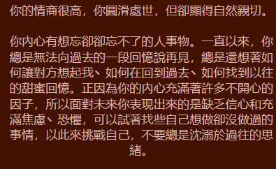 建議: 給自己放個假,多與家人或最信任的朋友相處。尋找能讓您感到舒適、放鬆的環境,重新充滿內在能量。