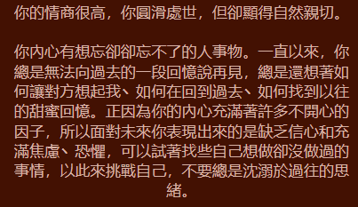 建議: 重新關注您的飲食和睡眠,進行一次徹底的大掃除或數位排毒。您需要一個簡單、純粹的環境來恢復內在的平靜和秩序。