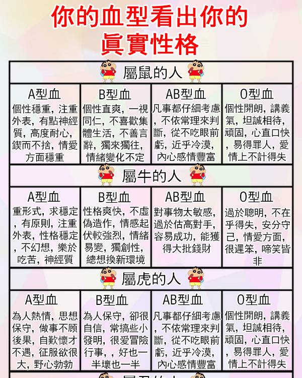 O型血:個性溫厚,重情重義。雖然進步較慢,但基礎打得非常穩固。