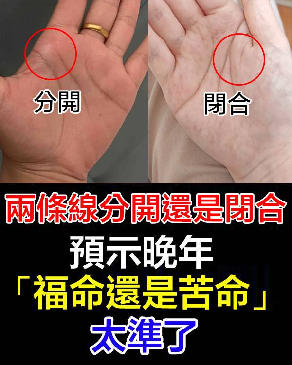 最近網路上瘋傳一張圖片,只要看 這兩條線是分開還是閉合,就能看出一個人 晚年的福氣指數,許多人看完都直呼「也太準!」